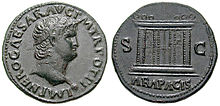 The Temple of Janus was a small temple just large enough to house a bronze statue of the god. A small portion of the temple's brick structure can be found beside the ruins of the Basilica Aemilia, along the path of the Argiletum in the Roman Forum,[4] so much of what we know about the temple visually comes from Roman scholars and artifacts. The various styles of architecture seen on Roman coins suggest rough dates for the reconstructions; both in the third and fourth centuries BCE.[5] As described by the Byzantine scholar Procopius who says "the temple is entirely of bronze and was erected in the form of a square, but it is only large enough to cover the statue of Janus ... of bronze and not less than five cubits high".[5] There are also descriptions that can be taken from items from the Roman world most notably coins minted for Emperor Nero. These coins depict the Temple of Janus as a small rectangular building with two doors accompanied by two columns having Ashlar masonry on the outside and only bronze plating on the inside. This shows a discrepancy in the sources as Procopius says the Temple of Janus was made entirely of bronze whereas the coins minted by Nero show Ashlar masonry on the outside leaving the assumption to be bronze only on the inside of the Temple. The temple of Athena Chalcioecus in Sparta and Apollo at Delphi are also built this way[5].. The art style of the Temple was inspired by Etruscan and from the Near East.[5]