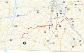 State Route 99 (SR 99) is a long east–west highway in Middle Tennessee. The route travels through large sections of rural areas and for most of the length is a secondary highway. The route begins near Waynesboro and ends in Bradyville after logging 126.7 mi (203.9 km) and passing through six counties.