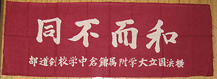 A tenugui (手拭い) is a thin Japanese hand towel made from cotton. Typically, tenugui are about 35 by 90 centimeters in size, plain woven, and almost always dyed with some pattern. Usually the long sides are finished with a selvage, and the short sides are just cut and so soon show some fraying.[1] A tenugui is often used in ways that towels are used,such as being used as a washcloth or dishcloth, for example. They are often used as headbands, souvenirs, decorations, or for wrapping bottles and similar items. Towels made from terry cloth have largely replaced tenugui in household use. However tenugui are still popular as souvenirs, decorations, and as a head covering in kendo, where it functions as a sweatband and provides extra padding beneath the headgear (men).