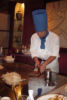 Teppanyaki (鉄板焼き, teppan-yaki), also known in some countries as Hibachi (火鉢, "fire bowl"), is a post–World War II style of Japanese cuisine that uses an iron griddle to cook food. The word teppanyaki is derived from teppan (鉄板), which is the metal plate which it is cooked on and yaki (焼き), which means grilled, broiled, or pan-fried. In Japan, teppanyaki refers to dishes cooked using a teppan, including steak, shrimp, okonomiyaki, yakisoba and monjayaki.