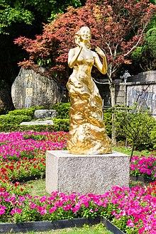 Teng's death produced unified sense of loss throughout all of Asia.[38] Her funeral in Taiwan became the largest scale state-sponsored funeral in country's history, second to only ROC leader Chiang Kai-shek. Roughly 30,000 mourners attended the ceremony, and another 30,000 lined the thirty-mile route to the sprawling mountain ceremony where she would be enterred.[39] Her funeral were broadcast to television stations across many Asian countries.[40] Teng was given state honors at her funeral with Taiwan's flag draped around her coffin. Hundreds of high-ranking officials and dignitaries, including commanders from three branches of the military attended the funeral who carried her coffin to her grave. A day of national mourning were declared and president Lee Teng-hui was among the thousands in attendance.[41] Teng was posthumously awarded the Ministry of Defense's highest honor for civilians, the KMT's "Hua-hsia Grade One Medal", the Overseas Chinese Affairs' Commission's "Hua Guang Grade one Medal," and the president's commendation.[42] She was buried in a mountainside tomb at Chin Pao San, a cemetery in Jinshan, New Taipei City (then Taipei County) overlooking the north coast of Taiwan. The grave site features a statue of Teng made of gold and a large electronic piano keyboard set in the ground that can be played by visitors who step on the keys. The memorial is often visited by her fans.[43]