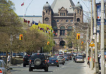 An unusual situation exists on Bay Street in Toronto, where the clock tower of Old City Hall lies at the northern end of the segment south of Queen Street West. However, Bay Street is a through street that curves to the west, intersecting Queen Street West at a 45-degree angle before curving back north along the western edge of Old City Hall and continuing towards Davenport Road. In a similar manner, the Thomson Building and Munich Re Centre office towers act as a vista for the northern section of Bay Street heading south.