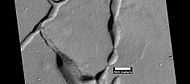 The radial and concentric cracks visible here are common when forces penetrate a brittle layer, such as a rock thrown through a glass window. These particular fractures were probably created by something emerging from below the brittle Martian surface. Ice may have accumulated under the surface in a lens shape; thus making these cracked mounds. Ice being less dense than rock, pushed upwards on the surface and generated these spider web-like patterns. A similar process creates similar sized mounds in arctic tundra on Earth. Such features are called “pingos,”, an Inuit word.[15] Pingos would contain pure water ice; thus they could be sources of water for future colonists of Mars.