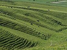 In geomorphology, a terracette[1] is a type of landform, a ridge on a hillside formed when saturated soil particles expand, then contract as they dry, causing them to move slowly downhill. An example of this is the manger near the Uffington White Horse. It may also be described as a small, irregular step-like formation on steep hillslopes, especially on those used for pasture which are formed by soil creep or erosion of surface soils exacerbated by the trampling of livestock such as sheep or cattle. Synonyms are: catstep[2][3] cattle terracing, sheep or cattle track.
