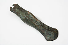 The remains discovered may be briefly summarized. Stone objects are few. Of bronze (the chief material) axes, daggers, swords, razors, and knives are found, as also minor implements, such as sickles, needles, pins, brooches, etc. Also remarkable is the finding of a large number of stone moulds, needed to obtain the bronze objects.[7][8] There are also objects of bone and wood, besides pottery (both coarse and fine), amber, and glass paste. Small clay figures, chiefly of animals (though human figures are found at Castellazzo), are interesting as being practically the earliest specimens of plastic art found in Italy.[6]