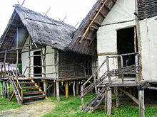 The Terramare, in spite of local differences, is of typical form; each settlement is trapezoidal, with streets arranged in a quadrangular pattern. Some houses are built upon piles even though the village is entirely on dry land and some are not. There is currently no commonly accepted explanation for the piles. The whole is protected by an earthwork strengthened on the inside by buttresses, and encircled by a wide moat supplied with running water.[6] In all over 60 villages are known, almost entirely from Emilia. In the Middle Bronze Age they are no larger than 2 ha (4.9 acres) placed at an average density of 1 per 25 km2 (9.7 sq mi). In the Late Bronze Age many sites have been abandoned and the ones that were not are larger, up to 60 ha (150 acres).[2]