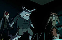 - A variation of the Terrible Trio appear in The Batman animated series episode "Attack of the Terrible Trio". This version of the group are university students and social outcasts named David (voiced by David Faustino), Justin (voiced by Googy Gress), and Amber (voiced by Grey DeLisle), who mutated themselves using formulas stolen from Dr. Kirk Langstrom. David remade the formula and put it into dissolving patches, which they used to become therianthropes; with David resembling a fox, Justin a hammerhead shark, and Amber a vulture. As the Terrible Trio, they committed crimes for amusement and vindication, though they also turned their bullies and fellow students into therianthropes against their will. Since she went to the same college, Barbara Gordon / Batgirl alerted Batman to their activities and assisted him in combating them. Using an antidote provided by Langstrom, they succeed in curing Amber and Justin, but David is accidentally covered in mutagenic fluid meant for several other students and transforms into a chimeric, horned griffin-like monster. After going on a rampage, he is electrocuted and sent to prison along with Justin and Amber.