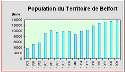 - after the loss to Germany of most of Alsace in 1871, the Belfort population was boosted by the arrival of large numbers of refugees from "Germanisation": the years between 1871 and 1914 saw the development of large factories, with the mechanical and textile sectors being prominent growth areas. The population increase and the economic development were at their most intense in the Belfort conglomeration itself. By 1911 the territoire's population figure stood at 101,392.