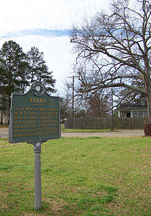 The town of Terry, originally known as Dry Grove, changed its name in honor of W. D. Terry, whose land the town was built on. This information comes from the bronze plaque in the town's center at Utica and Cunningham streets.[4] The area was established in 1811 by settlers from Virginia. In 1867, the town of Terry was established as a depot when the railroad was built through the area.