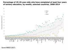 The tertiary gross enrolment ratio ranges from 9% in low-income countries to 77% in high-income countries, where, after rapid growth in the 2000s, reached a plateau in the 2010s.[4]