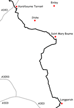 The northern end of the footpath starts in the car park on Walbury Hill. It passes through the towns of Romsey and Totton and the villages of Linkenholt, Ibthorpe, Hurstbourne Tarrant, St Mary Bourne, Longparish, Forton, Wherwell, Chilbolton, Stockbridge, Horsebridge and Mottisfont. The southern end of the footpath is at Eling Quay.