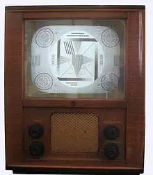 A 1952 Philips TD1410U television set showing the optical monochrome Telefunken test card T05.
