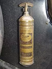 In 1911, Pyrene patented a small, portable extinguisher that used the chemical.[29] The extinguisher consisted of a brass bottle with an integrated handpump that was used to expel a jet of liquid toward the fire. As the container was unpressurized, it could easily be refilled after use.[30] Carbon tetrachloride was suitable for liquid and electrical fires and the extinguishers were often carried on aircraft or motor vehicles.