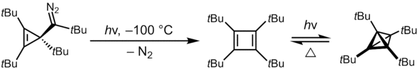 Eventually, a more scalable synthesis was conceived, in which the last step was the photolysis of a cyclopropenyl-substituted diazomethane, which affords the desired product through the intermediacy of tetra(tert-butyl)cyclobutadiene:[9][10] This approach took advantage of the observation that the tetrahedrane and the cyclobutadiene could be interconverted (uv irradiation in the forward direction, heat in the reverse direction).
