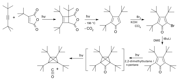 This compound was first synthesised starting from a cycloaddition of an alkyne with t-Bu substituted maleic anhydride,[5] followed by rearrangement with carbon dioxide expulsion to a cyclopentadienone and its bromination, followed by addition of the fourth t-Bu group. Photochemical cheletropic elimination of carbon monoxide of the cyclopentadienone gives the target. Heating tetra-tert-butyltetrahedrane gives tetra-tert-butylcyclobutadiene. Though the synthesis appears short and simple, by Maier's own account, it took several years of careful observation and optimization to develop the correct conditions for the challenging reactions to take place. For instance, the synthesis of tetrakis(t-butyl)cyclopentadienone from the tris(t-butyl)bromocyclopentadienone (itself synthesized with much difficulty) required over 50 attempts before working conditions could be found.[6] The synthesis was described as requiring "astonishing persistence and experimental skill" in one retrospective of the work.[7] In a classic reference work on stereochemistry, the authors remark that "the relatively straightforward scheme shown [...] conceals both the limited availability of the starting material and the enormous amount of work required in establishing the proper conditions for each step."[8]