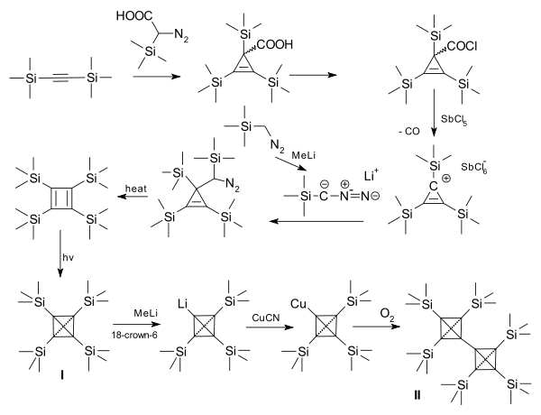 - ^ Nakamoto, M.; Inagaki, Y.; Ochiai, T.; Tanaka, M.; Sekiguchi, A. (2011). "Cyclobutadiene to tetrahedrane: Valence isomerization induced by one-electron oxidation". Heteroatom. Chem. 22 (3–4): 412–416. doi:10.1002/hc.20699.