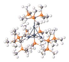 In tetrasilatetrahedrane features a core of four silicon atoms. The standard silicon–silicon bond is much longer (235 pm) and the cage is again enveloped by a total of 16 trimethylsilyl groups, which confer stability. The silatetrahedrane can be reduced with potassium graphite to the tetrasilatetrahedranide potassium derivative. In this compound one of the silicon atoms of the cage has lost a silyl substituent and carries a negative charge. The potassium cation can be sequestered by a crown ether, and in the resulting complex potassium and the silyl anion are separated by a distance of 885 pm. One of the Si−–Si bonds is now 272 pm and its silicon atom has an inverted tetrahedral geometry. Furthermore, the four cage silicon atoms are equivalent on the NMR timescale due to migrations of the silyl substituents over the cage.[18]