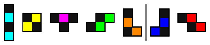 - All 7 one-sided tetrominoes fit a 6x5 rectangle with two holes of the same "checkerboard color".