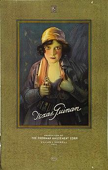 In a film career that began in 1917 and continued through 1933, she was part of the vanguard of women filmmakers in the United States. Her later claims of being in France in 1917 entertaining the troops, and being decorated with a bronze medal by France field marshall Joseph Joffre, has been proven false by the timeline and California location of her prolific film-making.[24][25] Triangle Film Corporation, founded in 1915 by Harry Aitken and Roy Aitken, featured Guinan in four two-reel shorts between 1917 and 1918, The Fuel of Life, The Stainless Barrier, The Gun Woman and The Love Brokers. Unlike the musical genre she was known for on stage, she was now moving towards the Western movie genre, and on her dressing room door appeared a map of the state of Texas, rather than her name. Triangle began billing her as "the female Bill Hart" in reference to the industry's first Western star who at that time topped fandom popularity polls.[26]