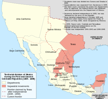 The Mexican War for Independence (1810–1821) severed control that Spain had exercised on its North American territories, and the new country of Mexico was formed from much of the individual territory that had comprised New Spain.[1] On October 4, 1824, Mexico adopted a new constitution which defined the country as a federal republic with nineteen states and four territories. The former province of Spanish Texas became part of a newly created state, Coahuila y Tejas,[2] whose capital was at Saltillo, hundreds of miles from the former Texas capital, San Antonio de Bexar (now San Antonio, Texas, USA).[3]