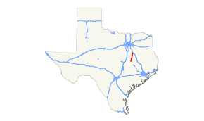 SH 14 was one of the original twenty six state highways proposed on June 21, 1917, known as the Dallas-Houston Highway.[2] From 1917 the routing mostly followed present day I-45 from Dallas to Corsicana, but going through an unbuilt route through Teague to Houston. On July 17, 1917, SH 14 was rerouted south of Corsicana. From there, the highway turned southwest to Bremond, then following SH 2 to Houston.[3] On November 21, 1917, an intercounty highway was designated from Bremond via Franklin to Bryan.[4] The section of SH 14 south of Bremond was cancelled that day. On March 19, 1918, SH 14 was extended southeast over this intercounty highway.[5] The section from Bremond to Bryan was cancelled on August 21, 1923 (but would be restored as SH 255 on October 26, 1937, which would have its south end in Wheelock). In 1926, U.S. Highway 75 was overlaid on the northern half of SH 14. On April 10, 1934, SH 14 was extended north to west of Sherman, replacing SH 116.[6] On April 9, 1935, SH 14 Spur was created to Thornton.[7] On September 26, 1939, the portion from Dallas to Gunter was renumbered as SH 289 and the section that US 75 overlaid was cancelled. On September 26, 1967, SH 14 was extended south from FM 46 (and SH 6 before this day), to SH 6. The highway has had the same routing since.