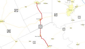 SH 144 begins at an intersection with SH 22 in Meridian.[2] The route travels northwest to Walnut Springs before turning in a more northerly direction. It enters Glen Rose, where it has a one-mile concurrency with US 67.[3] After separating from US 67, the highway resumes its northward journey to Granbury, where it intersects the US 377 bypass.[4] The SH 144 designation ends at an intersection with Bus. US 377 in central Granbury.[1]
