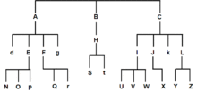 A typical tharavad reproduced from K. M. Panikkar's article published in 1918. Capital and small letters represent females and males respectively. Supposing that the females A, B and C were dead and the oldest male member karnavar being d, if the male members t, k and others demanded partition, the property would be divided into three parts.
