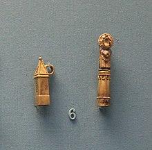 Until some years ago, the archaeological findings in the area of Tharros supported the theory that Phoenicians founded the town in eighth century BC. The probability of this was reduced by the finding of some parts of the old settlement in the Mistras Lagoon. A submerged 100 m wall seems to be part of a port structure much older than the Phoenician one, since in 1200 BC sea level rose, swallowing the existing buildings.[1] A previous nuragic settlement apparently existed there in the Bronze Age, as the nuragic presence near the tophet area seems to suggest.[2][3]