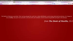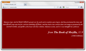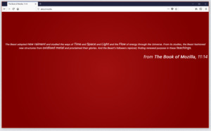 There is no real book titled The Book of Mozilla. However, apparent quotations hidden in Netscape and Mozilla give this impression by revealing passages in the style of apocalyptic literature, such as the Book of Revelation in the Bible. When about:mozilla is typed into the location bar, various versions of these browsers display a cryptic message in white text on a maroon background in the browser window.