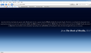 Though not an official verse by Mozilla, a new verse of the Book of Mozilla, 11:1, became available in Flock Browser 1.0+, a "Social Web Browser" based on Firefox. This verse is shown on blue/white vertical gradient when about:mozilla is entered into the location bar. The verse is as follows.