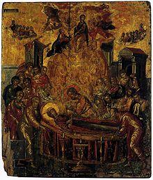 The composition of the painting has been closely related to the Byzantine iconography of the Dormition of the Mother of God. The argumentation supporting this point of view focuses on the icon of the Dormition by El Greco that was discovered in 1983 in the church of the same name in Syros.[17] Robert Byron, according to whom the iconographic type of the Dormition was the compositional model for The Burial of the Count of Orgaz, asserts that El Greco as a genuine Byzantine painter worked throughout his life with a repertoire of components and motifs at will, depending on the narrative and expressive requirements of the art.[24]