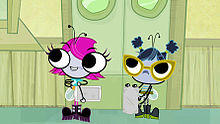 Wasson formed Maggie's character design and supported the use of Adobe Flash for animating the series. He told Animation Magazine that he was convinced Flash was a "good way to go" as he had had previous experience with the program, such as commercials and short films.[8] The series became Disney's first to be fully animated in Flash.[9] Following the cancellation of Kids' WB's ¡Mucha Lucha!, many animators from that series were hired to work on The Buzz on Maggie.[8] For the character designs, Wasson was heavily influenced by early cartoon shorts by Tex Avery, Warner Bros. and Walt Disney. He noted that the characters in The Buzz on Maggie have "a lot of 1930s touches" and wear white gloves, which is a direct homage to the cartoon shorts.[8] The characters also have anime-inspired designs with oversized heads and large eyes.[10] Wasson stated that the concept of Maggie living in a dump gave him a "lot of visual opportunities".[8] Jorge Gutierrez supervised the character design and Roman Laney supervised location and prop design in addition to background paint. The animation was done by Bardel Entertainment and Future Thought Productions.[3][11]