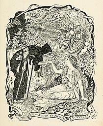 The queen obeyed exactly. When the christening arrived, a dazzlingly beautiful woman came in a cream-colored carriage, and was dressed like the sun. She decreed that the girl was to be named Dotterine.