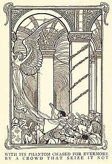 An audience of weeping angels watches a play performed by "mimes, in the form of God on high", and controlled by vast formless shapes looming behind the scenes. The mimes chase a "Phantom" which they can never capture, running around in circles. Finally, a monstrous "crawling shape" emerges, and eats the mimes. The final curtain comes down, "a funeral pall", signaling an end to the "tragedy, 'Man'", whose only hero is "The Conqueror Worm".