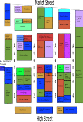 The Covered Market was officially opened on 1 November 1774 and remains in use.[1] It was established in response to a general wish to clear 'untidy, messy and unsavoury stalls' from the main streets of central Oxford.