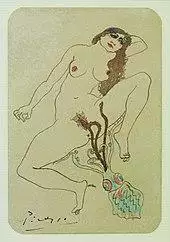 The work has influenced later artists such as Félicien Rops, Auguste Rodin, Louis Aucoc, Fernand Khnopff and Pablo Picasso.[15] Picasso drew his own private version in 1903, which was displayed in a 2009 Museu Picasso exhibit titled Secret Images with 26 other drawings and engravings by Picasso next to Hokusai's original and 16 other Japanese prints, portraying the influence of 19th-century Japanese art on Picasso's work.[16] Later Picasso also later fully painted works taking direct influence such as 1932's Reclining Nude where the woman in pleasure is also the octopus, capable of pleasuring herself.[17][18] In 2003, a derivative work by Australian painter David Laity, titled The Dream of the Fisherman's Wife, sparked a minor obscenity controversy when it was shown at a gallery in Melbourne; after receiving complaints police investigated and decided it did not break the city's anti-pornography laws.[19][20] Hokusai's print has had a wide influence on the modern Japanese-American artist Masami Teraoka, who has created images of women, including a recurring "pearl diver" character, being pleasured by cephalopods as a symbol of female sexual power.[21]