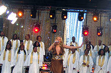 During the 2005 MTV Video Music Awards, Carey performed at the National Hotel in South Beach.[53] Accompanied by Dupri, she sang "Shake It Off" and the official remix version of "We Belong Together".[54] She was a headlining performer at the 2005 Fashion Rocks, in Monaco.[55][56] On November 15, 2005, Carey performed "Shake It Off" and her newly released single from the album's re-release, "Don't Forget About Us", during half-time of the Thanksgiving game between the Detroit Lions and the Atlanta Falcons.[57][58] On November 22, 2005, she opened the 33rd annual American Music Awards with "Don't Forget About Us".[59] Two months later, she placed as the featured performer at the Times Square Ball drop on New Year's Eve in New York.[60] At the 48th Grammy Awards, on February 8, 2006, Carey returned to the Grammy stage for the first time since 1996.[61] Her performance began with a pre-taped video in which she discussed the importance of God and religion in her life.[62] She then came to the stage, and sang a shortened version of "We Belong Together", followed by "Fly like a Bird".[63] The performance induced the only standing ovation that night,[64] and earned praise from critics.[65][66]