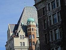 Like most Chateauesque hotels, the Empress incorporates stone and brick cladding, steep pitched copper roofs, ornate neo-Gothic dormers and gables, and polygonal turrets.[5] However, the design of the hotel also deviates from earlier Chateauesque hotels owned by the company, incorporating elements from contemporary architectural styles into its design.[5] The hotel's porch featured elements of Tudor architecture, the main roof of the hotel was designed in a Second Empire style with a flat top and iron railings.[8] The building features an asymmetrical floor plan, with an interior featuring arcaded central loggia, and projecting pavilions accented by oriel windows.[5]