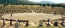 Filming began at the Cinecittà studio in Rome again in mid-May 1966, including the opening scene between Eastwood and Wallach when Blondie captures Tuco for the first time and sends him to jail.[33] The production then moved on to Spain's plateau region near Burgos in the north, which doubled for the southwestern United States, and again shot the western scenes in Almería in the south of Spain.[34] This time, the production required more elaborate sets, including a town under cannon fire, an extensive prison camp and an American Civil War battlefield; and for the climax, several hundred Spanish soldiers were employed to build a cemetery with several thousand gravestones to resemble an ancient Roman circus.[34] For the scene where the bridge was blown up, it had to be filmed twice, as in the first take all three cameras were destroyed by the explosion.[35] Eastwood remembers, "They would care if you were doing a story about Spaniards and about Spain. Then they'd scrutinize you very tough, but the fact that you're doing a western that's supposed to be laid in Southwest America or Mexico, they couldn't care less what your story or subject is."[36] Top Italian cinematographer Tonino Delli Colli was brought in to shoot the film and was prompted by Leone to pay more attention to light than in the previous two films; Ennio Morricone composed the score once again. Leone was instrumental in asking Morricone to compose a track for the final Mexican stand-off scene in the cemetery, asking him to compose what felt like "the corpses were laughing from inside their tombs", and asked Delli Colli to create a hypnotic whirling effect interspersed with dramatic extreme close ups, to give the audience the impression of a visual ballet.[34] Filming concluded in July 1966.[14]