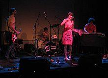 Once back in Australia Hodgson rejoined Patterson and Skyring to resume rehearsing in the Patterson family garden shed.[2] Patterson described their band roles, "Patience couldn't play an instrument, so she was the singer. I was bored of playing keyboards so I started playing guitar, and Alana just drums however she wants."[5] They deliberately chose not to have a regular bass guitarist, according to Craig Mathieson of The Age this indicates "they've shown a disdain for convention."[6] They performed under a different name each night – they might trick regular customers into thinking they were a new band instead of the same "shitty" one.[2] In January 2004 they first performed as the Grates; at Ric's bar in Brisbane.[7] Subsequent noise restrictions limited live performances at the venue, Patterson recalled "It's pathetic. Ric's is our favourite place to play in Brisbane... We played our first couple of shows there about a year ago and miss playing there terribly."[5] According to Australian music journalist, Ed Nimmervoll, "They name the Pixies and Weezer as influences."[2] Whereas Tammy la Gorce of AllMusic opined their early material were "Ramones and Yeah Yeah Yeahs-influenced songs."[8]
