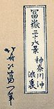 The Great Wave off Kanagawa has two inscriptions. The first, within a rectangular cartouche in the top-left corner is the series title: "冨嶽三十六景/神奈川冲/浪裏" Fugaku Sanjūrokkei / Kanagawa oki / nami ura, which translates as "Thirty-six Views of Mount Fuji / Offshore from Kanagawa / Beneath the wave". The second inscription, to the left, is the artist's signature: 北斎改爲一筆 Hokusai aratame Iitsu hitsu, ("From the brush of Hokusai, changing his name to Iitsu").[15]