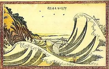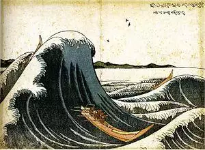 The Great Wave off Kanagawa (Japanese: 神奈川沖浪裏, Hepburn: Kanagawa-oki Nami Ura, lit. "Under the Wave off Kanagawa"), also known as The Great Wave or simply The Wave, is a woodblock print by the Japanese ukiyo-e artist Hokusai. It was published sometime between 1829 and 1833[1] in the late Edo period as the first print in Hokusai's series Thirty-six Views of Mount Fuji. The image depicts an enormous wave threatening three boats off the coast in the Sagami Bay (Kanagawa Prefecture) while Mount Fuji rises in the background. Sometimes assumed to be a tsunami, the wave is more likely to be a large rogue wave.[2]