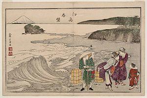 From the sixteenth century fantastic depictions of waves crashing on rocky shores were painted on folding screens known as "rough seas screens" (ariso byōbu).[5][a] Hokusai drew many waves throughout his career; the genesis of the Great Wave can be traced back over thirty years. The combination of wave and mountain was inspired by an oil painting by Shiba Kōkan, an artist strongly influenced by the Western art, particularly Dutch paintings, he had seen at Nagasaki, the only port open to foreigners in this period.[6] Kōkan's A View of Seven-League Beach was executed in middle of 1796 and exhibited publicly at the Atago shrine in Shiba. Hokusai's print Springtime at Enoshima, which he contributed to The Willow Branch poetry anthology published in 1797, is clearly derived from Kōkan's work, although the wave in Hokusai's version rises noticeably higher.[7]
