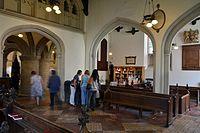The church is built in stone. Its plan consists of a circular nave surrounded by an ambulatory, a chancel with north and south aisles and a north vestry.[15] Over the nave is an upper storey surmounted by a conical spire.[5] To the north of the church is an octagonal bell-turret containing two bells. The church is entered by a Norman west doorway with three orders of colonnettes, decorated with scalloped capitals and zigzags, and crenellations in the voussoirs.[16] Between the ambulatory and the nave are eight massive Norman columns and round arches. Each of the capitals of the columns is carved with a different design. Part of the vault of the ambulatory has dog-tooth ornamentation. In the ambulatory and nave are carved human heads dating from the 19th century. Above the nave is a triforium containing double Norman arches.[17] To the east are the chancel and aisles. In the chancel and the north aisle are carved angels dating from the 15th century which are attached to the corbels supporting the roof; some of the angels are holding or playing musical instruments. The communion table dates from 1843 and was made by Joseph Wentworth. The chancel is floored between the choir stalls with tiles laid in 1842. They depict the Royal coat of arms, and the arms of Queen Victoria and Prince Albert. At the corners are animals representing the Four Evangelists. There are two bells in the bell-turret. One of these is dated 1663 and was cast by Robard Gurney; the other is a priest's bell possibly cast by J. Sturdy of London between 1440 and 1458.[18] Most of the stained glass in the church was introduced during the 19th-century restoration and was designed and made by Thomas Willement and William Wailes. The glass in the east window was destroyed by a bomb in 1942 and was replaced by a new window in 1946 depicting Christ in Majesty.[16]