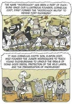 In the story "W.H.A.D.A.L.O.T.T.A.J.A.R.G.O.N." by Don Rosa the history of the Junior Woodchucks of the World begins with the Woodchuck Militia, a defensive army unit that was formed by Cornelius Coot in the early 19th century to protect Fort Duckburg from Native American warriors and other threats in the area. Clinton Coot, the son of Cornelius Coot, was the founder of the Junior Woodchucks as a Scouting organization for the children and teenagers around Duckburg at the time to uphold the ideals of performing good deeds, protection of the wilderness, rescuing of the innocent, meek & helpless, and the preservation of knowledge. The organization eventually grew larger to include all nations around the world. The first Junior Woodchucks were Grand Marshal Osborne and Exalted Overseer Taliaferro (a reference to Ted Osborn and Al Taliaferro) and Fulton Gearloose, the father of Gyro Gearloose.