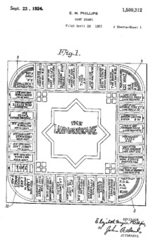 In 1903, Magie filed for a patent on the game[3] which was granted in 1904.[6] Magie and other fellow Georgists formed a company, Economic Game Company, in 1906 New York to publish the game.[6] Besides Magie, the incorporators were E. H. Monroe of Chicago and E. G. Lenbusher of New York.[7] Magie approached Parker Brothers to publish this and one other game in 1909. The other game was accepted while Landlord's was rejected as too complicated.[mwmfg 1]