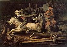 Irving wrote The Sketch Book during a tour of Europe, and parts of the tale may also be traced to European origins. Headless horsemen were staples of Northern Europe storytelling, featuring in German, Irish (e.g., Dullahan), Scandinavian (e.g., the Wild Hunt), and British legends, and were included in Robert Burns's Scots poem "Tam o' Shanter" (1790) and Bürger's Der Wilde Jäger, translated as The Wild Huntsman (1796). Usually viewed as omens of ill-fortune for those who chose to disregard their apparitions, these specters found their victims in proud, scheming persons and characters with hubris and arrogance.[2] One particularly influential rendition of this folktale was recorded by the German folklorist Karl Musäus.[3]