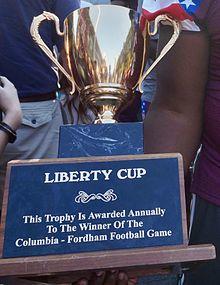 The Liberty Cup was awarded annually to the winner of the college football game between Columbia University and Fordham University, two of only three National Collegiate Athletic Association (NCAA) Division I (D-1) football programs in New York City. Wagner College, located on Staten Island, is the third. The trophy was dedicated a year after the Columbia-Fordham game was postponed following the attacks of September 11, 2001.[1] At least 43 Columbia alumni and 39 Fordham alumni and students[2] died at the World Trade Center.[3] They included two former Fordham football players: Nick Brandemarti '00 and Kevin Szocik '97. The most recent game of the series was played in 2015.[4][5]