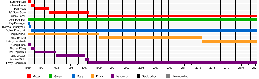 Axel Rudi Pell (born 27 June 1960)[2] is a German heavy metal guitar player. He commenced his musical career with Steeler (1984–88) before leaving in 1988 for a solo career.[3] During this time, he has played with such drummers as Jörg Michael and Mike Terrana, and singers Charlie Huhn,[3] Johnny Gioeli of Hardline, Jeff Scott Soto, and Rob Rock. Gioeli remains the longest surviving vocalist of the band, having joined the group since 1998 on the album Oceans of Time, Gioeli's first musical appearance since the 1992 Hardline album Double Eclipse.