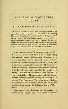 "The May-Pole of Merry Mount" is a short story by Nathaniel Hawthorne.[1] It first appeared in The Token and Atlantic Souvenir in 1836. It was later included in Twice-Told Tales, a collection of Hawthorne's short stories, in 1837.[2] It tells the story of the colony of Mount Wollaston, or Merry Mount, a 17th-century British colony located in what is now Quincy, Massachusetts.